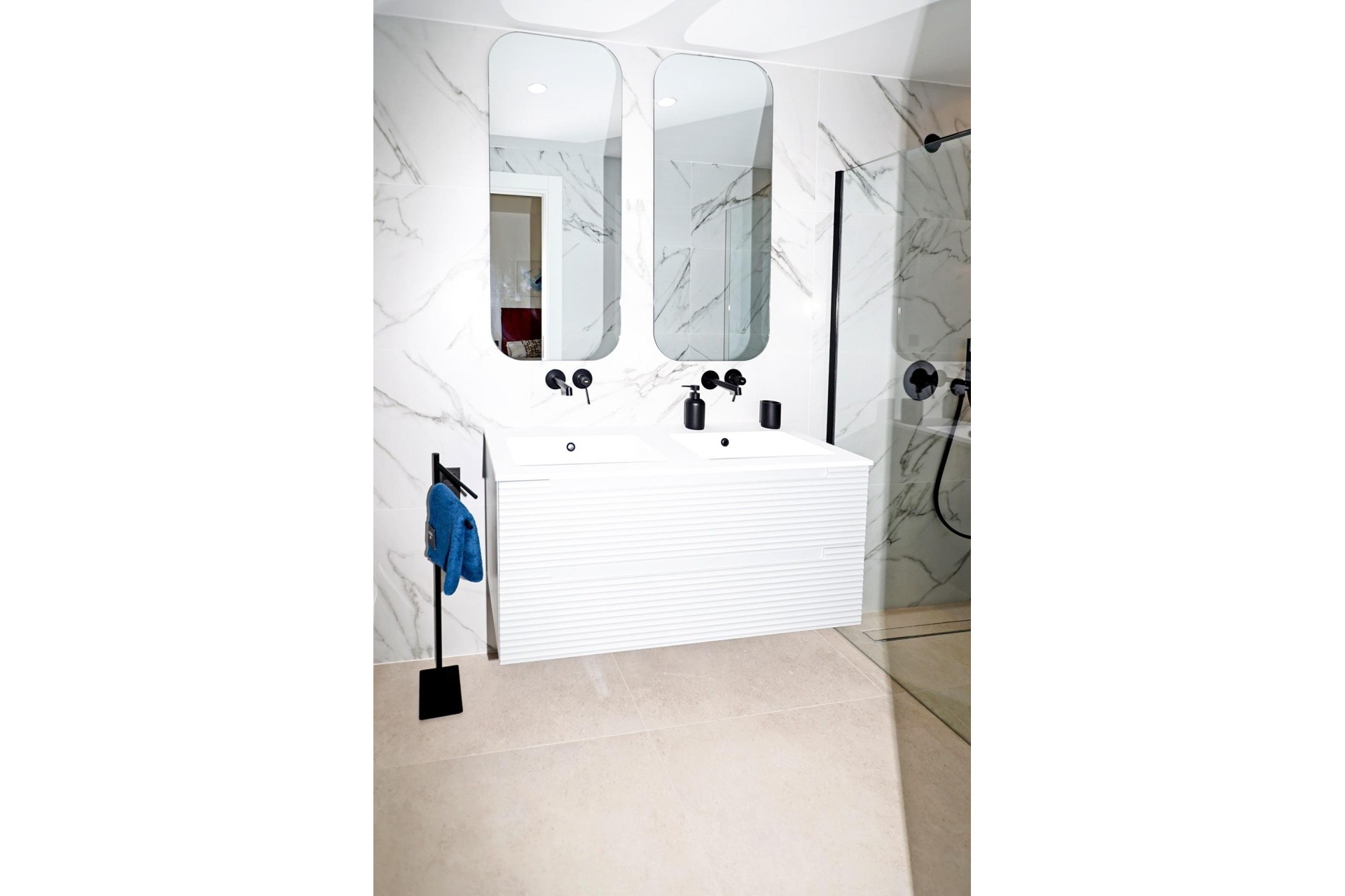 Villa neuve de plain-pied avec 3 chambres, 2 salles de bains, cuisine ouverte sur un salon spacieux, armoires équipées, terrasse, jardin privé avec piscine et place de parking.